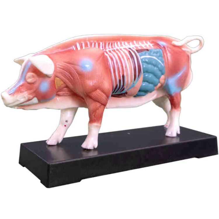 The left half of the model shows the constitution of a Shanghai white boar and 55 acupuncture points often in used on the head, neck, buttock, tail and limbs. The right half shows the superficial layer muscles, and the longitudinal section of the dorsal vertebral column and the internal organs. Made of PVC plastic.
